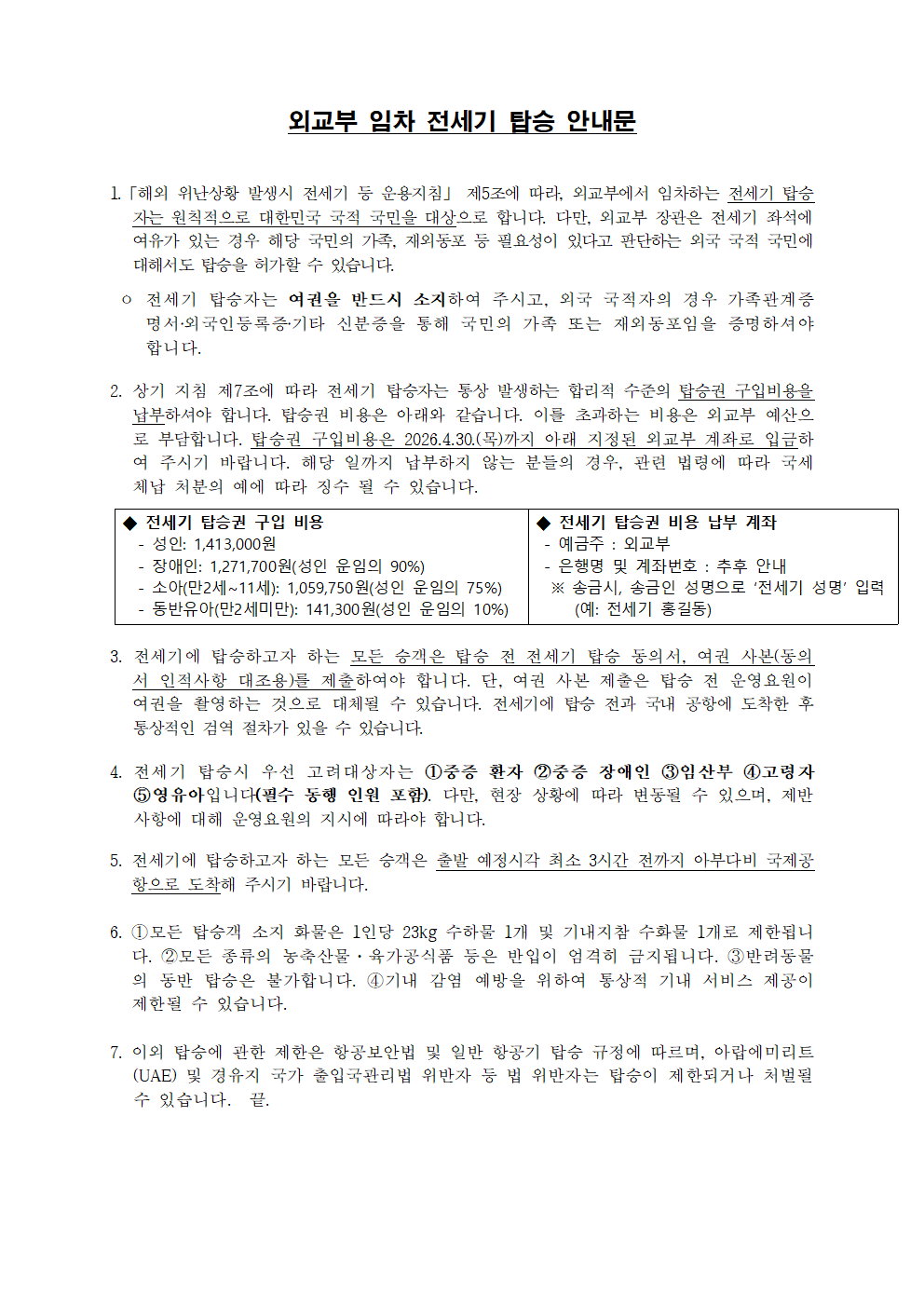2. 비용개별 사후 청구 예정 (상세 내용은 아래 탑승 안내문 참고)
